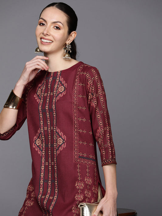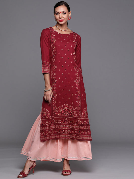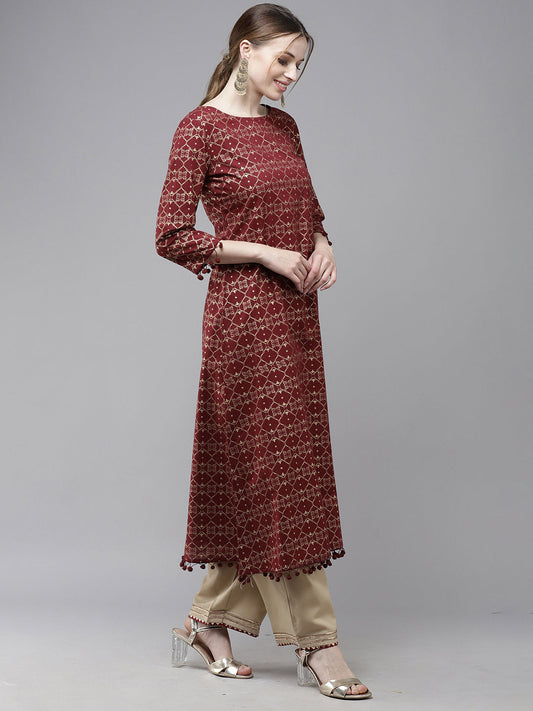 Maroon Ethnic Motifs Foil Printed Straight Kurta