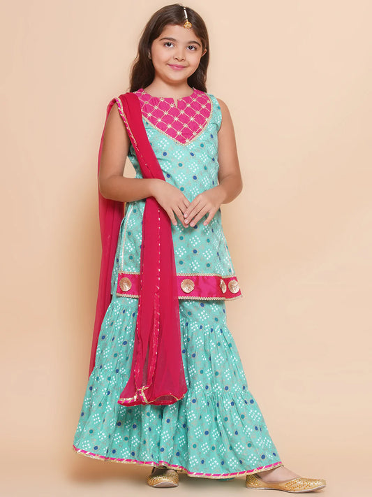 Girls blue Bandhani Printed Angrakha Gotta Patti Kurta With Sharara With Dupatta