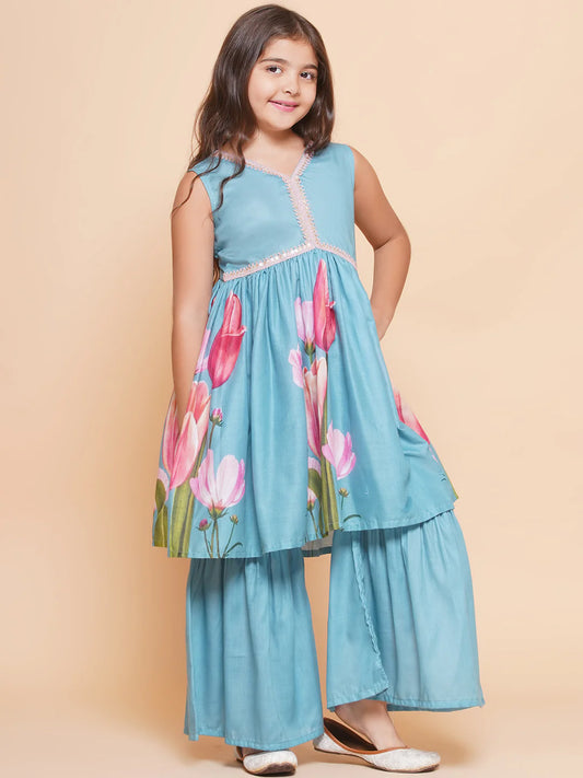 Girls Blue Floral Printed Round- Neck Kurta with Sharara with Dupatta
