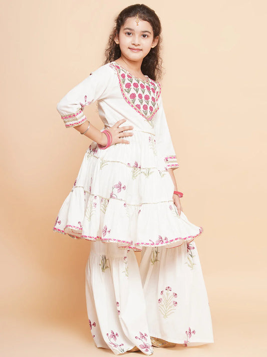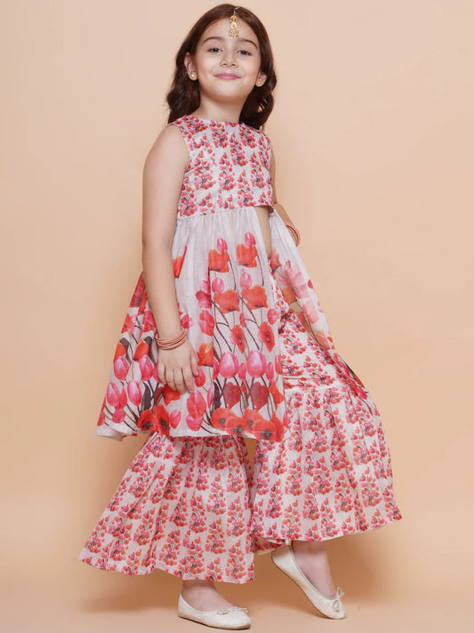 Girls Off-white Pink Printed Round- Neck Kurta with Sharara with Dupatta