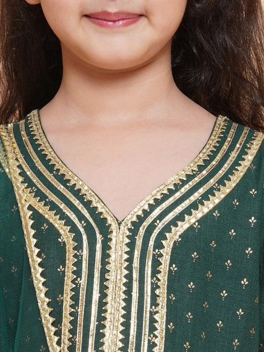 Girls Sea Green Gold Printed Kurta & Sharara With Dupatta
