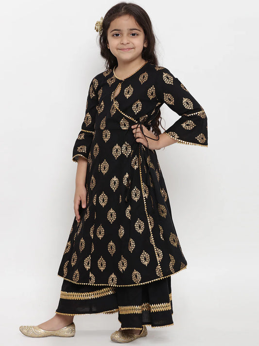 Girls Black Foil Printed Angrakha Kurta With Palazzos