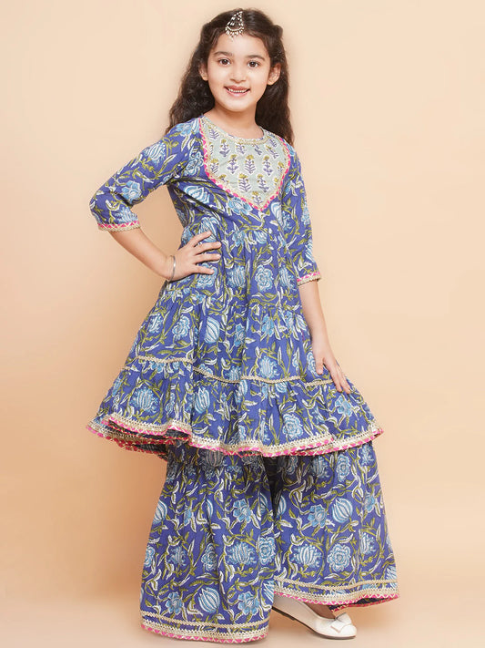 Girls Blue Floral Printed Angrakha Gotta Patti Kurta Sharara set With Dupatta
