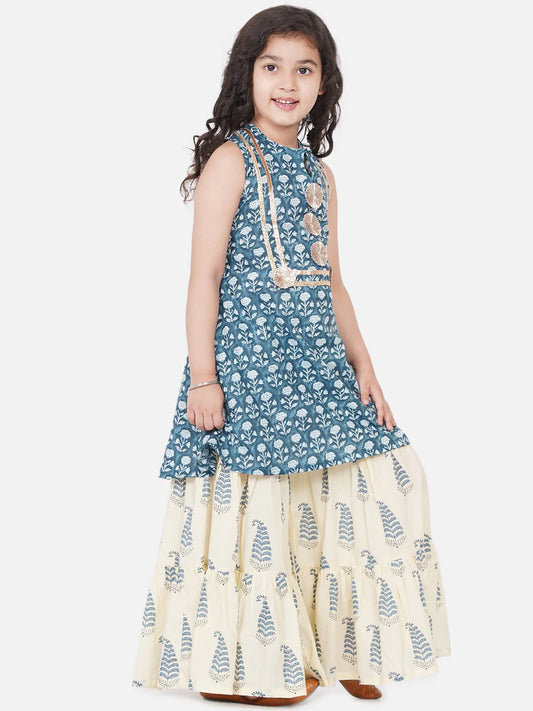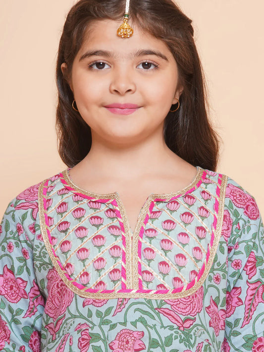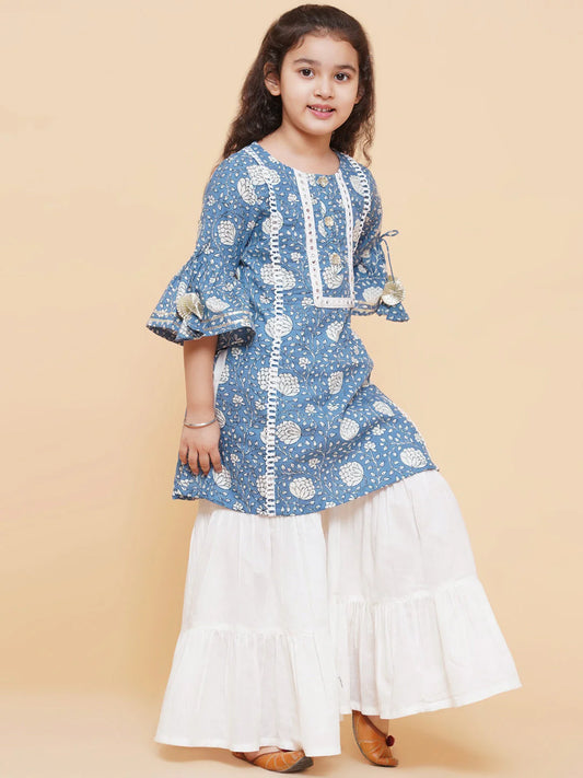 Girls Blue Floral Printed Cotton Kurta With Sharara with Dupatta