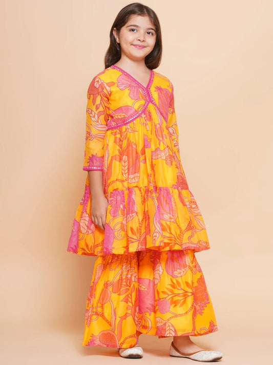 Girls Yellow Floral Printed Alia Design Kurta With Sharara