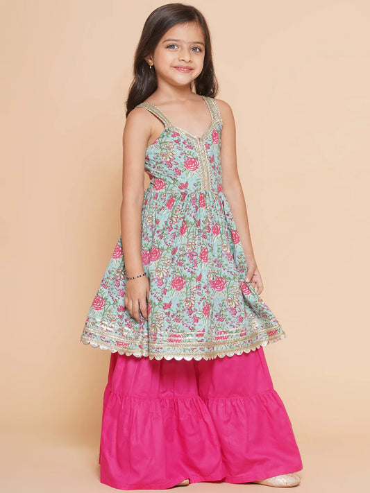 Girls Turquoise Blue Printed Alia Design Kurta & Sharara