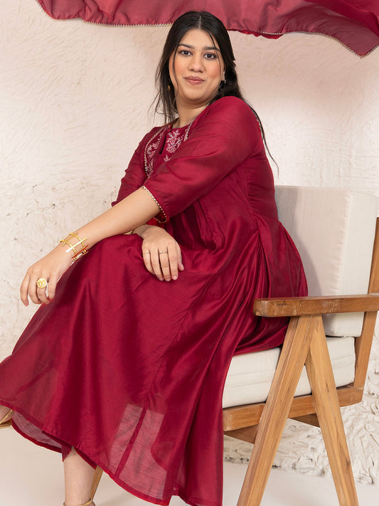Plus Size Red Chanderi Embellished Kurta with Palazzo and Dupatta