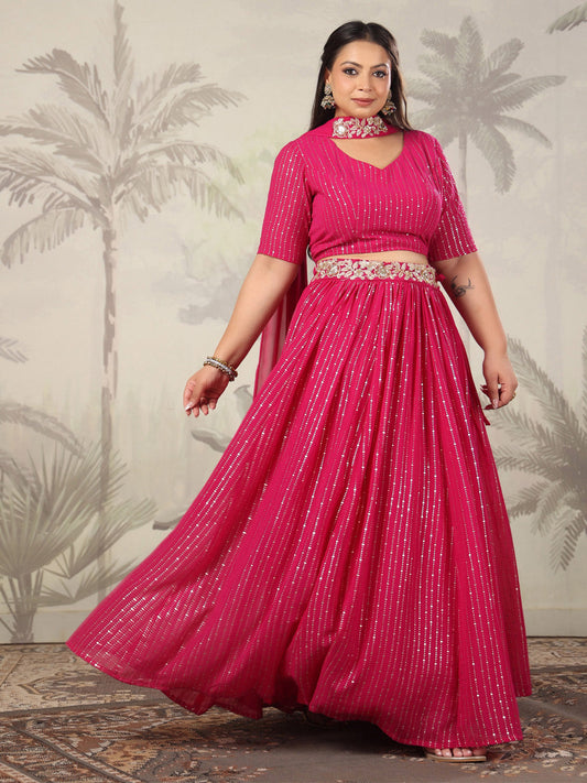 Plus Size Pink Georgette Foil Printed Gathered Embellished Lehenga Choli Set