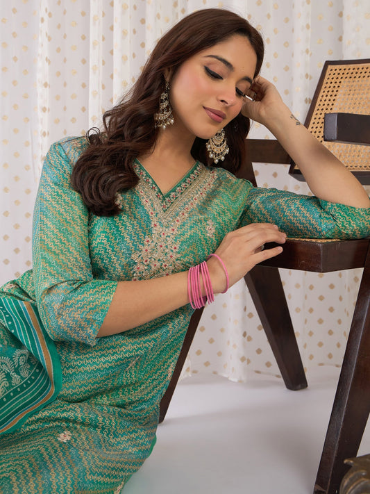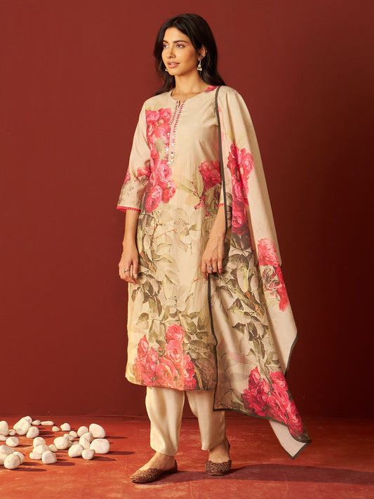 Beige Printed Silk Blend Straight Women Kurta Trouser With Dupatta
