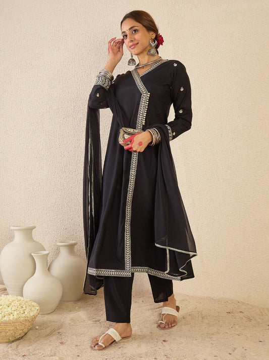 Black Embroidered Silk Blend A-Line Kurta Set With Dupatta