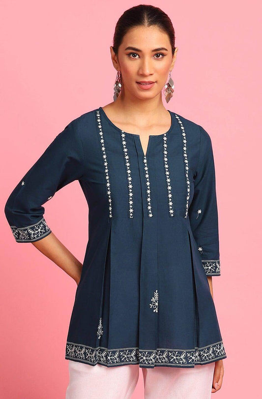 Navy Blue Cotton Embroidered Trapeze Tunic