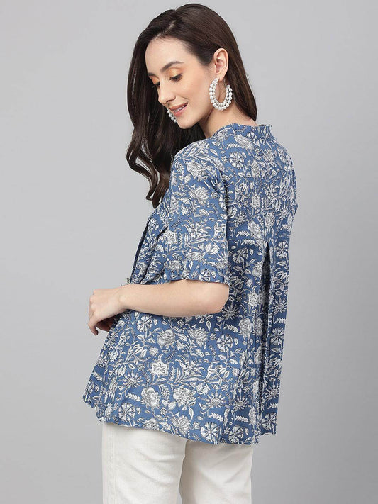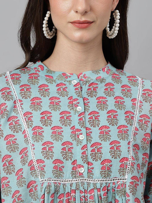 Women's Aqua Blue Cotton Block Print A-Line Top