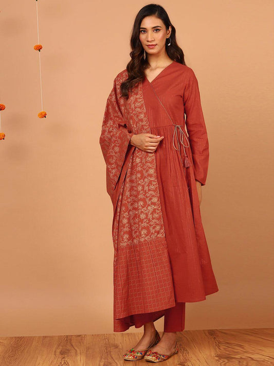 Orange Cotton Striped Kurta With Pant And Dupatta