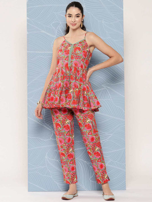 Women's Pink Cotton Floral Print Kurta With Palazzo And Dupatta