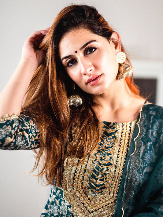 Teal Cotton Foil Floral Printed Kurta With Palazzo And Dupatta