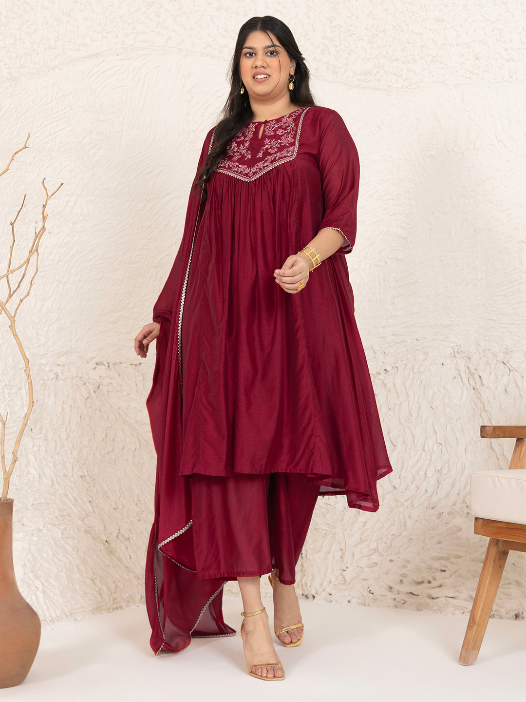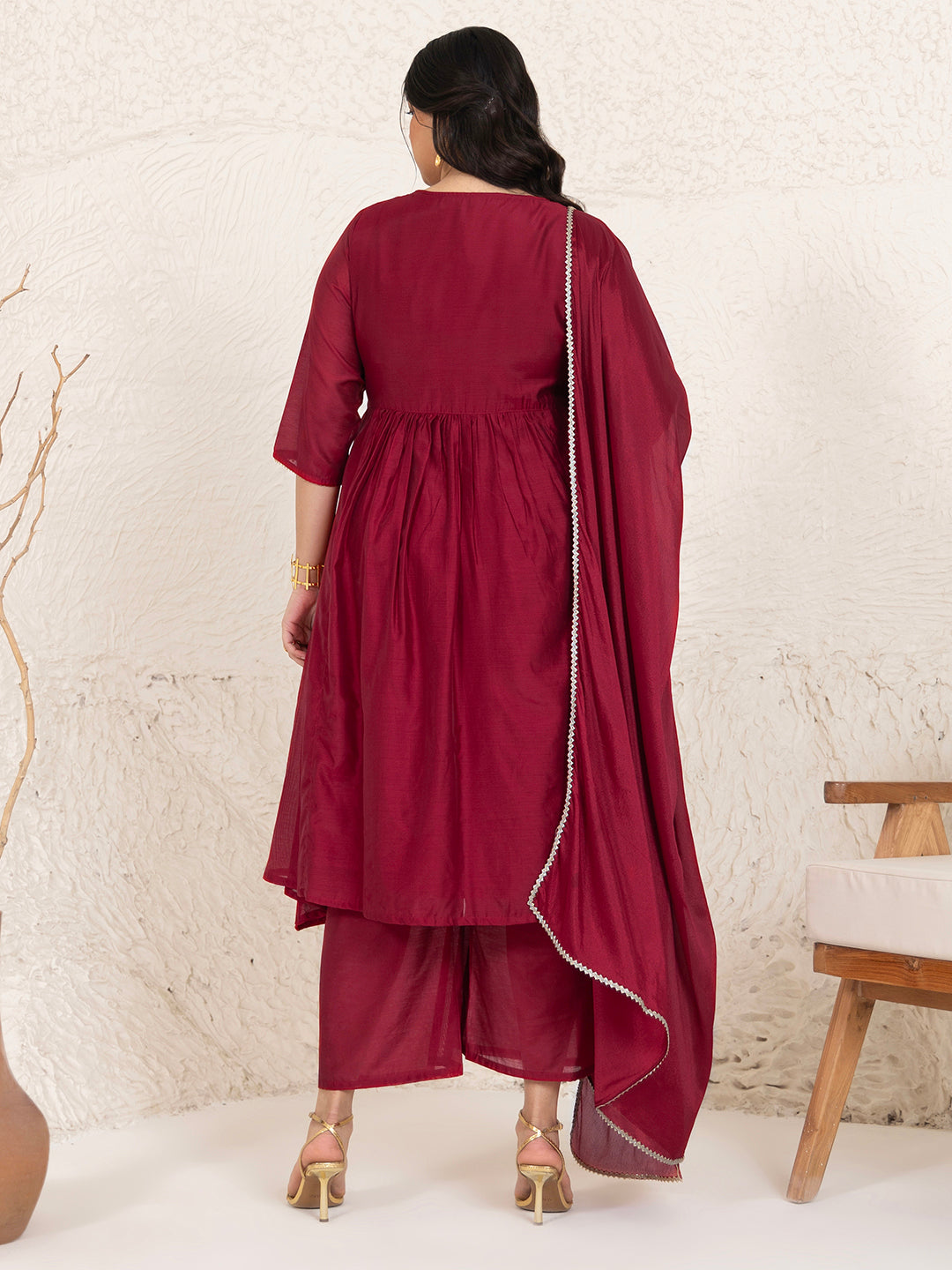 Plus Size Red Chanderi Embellished Kurta with Palazzo and Dupatta