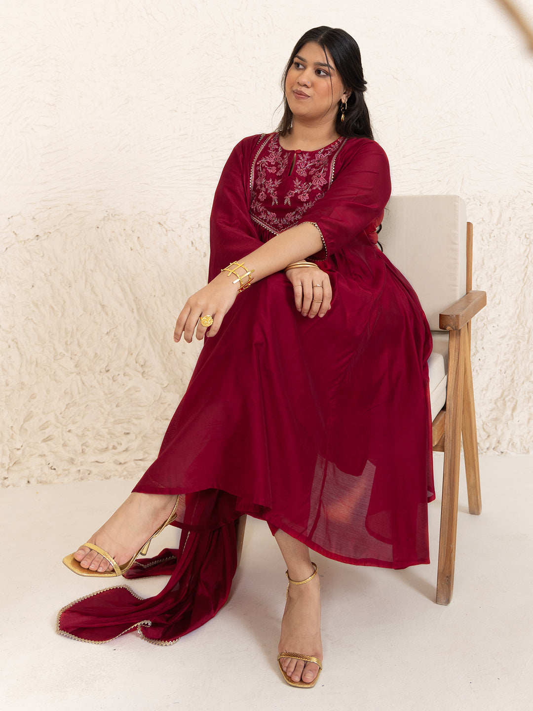 - Step Into Elegance With This Red Chanderi Silk Anarkali Kurta Set Adorned With Exquisite Embroidery On The Yoke. The Round Neck, Gathered Details, And Gota Patti Embellishments Create A Graceful Ensemble That's Perfect For Any Special Occasion. The Rich Chanderi Silk Fabric Enhances The Luxurious Feel, Ensuring You Exude Charm And Sophistication. This Kurta And Pant Set Is Not Just An Outfit, But A Statement Piece That Seamlessly Combines Tradition And Contemporary Style. Pair It With Minimal Accessories To Let The Intricate Details Shine, And You'll Undoubtedly Stand Out With Grace And Poise At Your Next Event.
