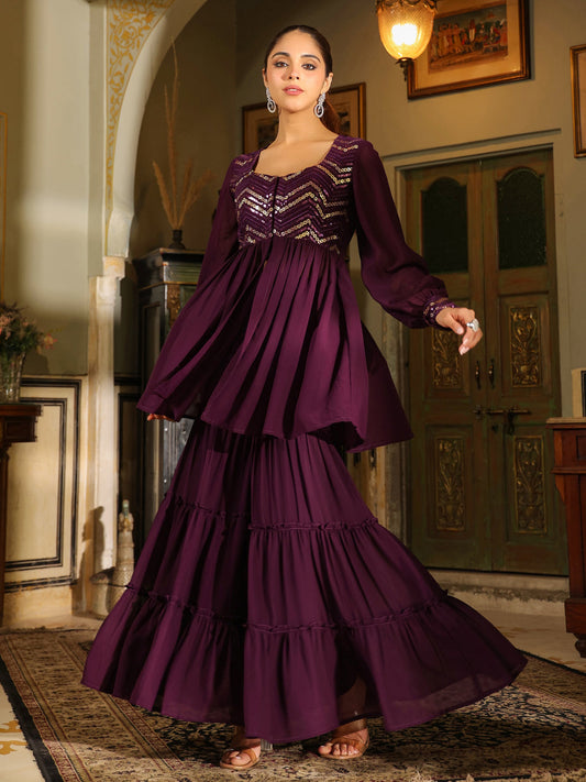 Purple Georgette Sequined Front Slit Peplum Sharara Set
