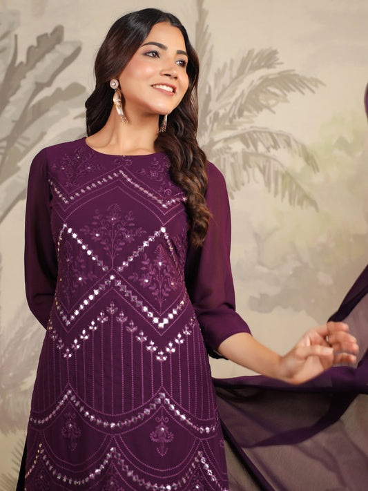 Purple Georgette Mirror Work Embroidered Straight Kurta With Palazzo Set