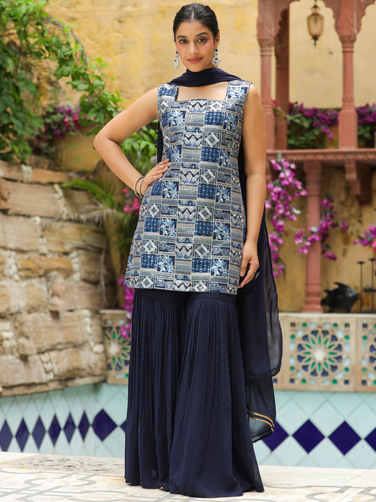 Navy Blue Georgette Embroidered Straight Kurta Set