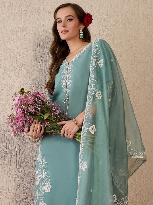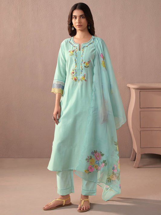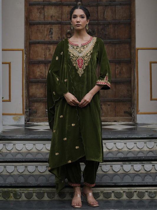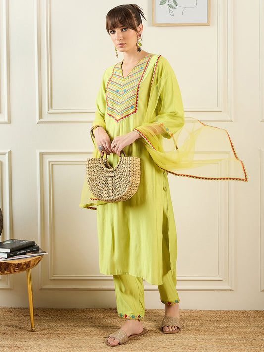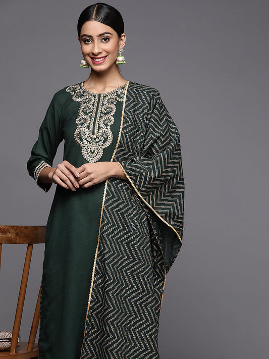 Indo Era Green Embroidred Straight Kurta Trouser With Dupatta Set
