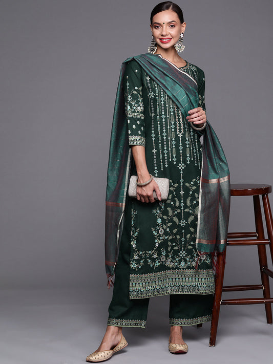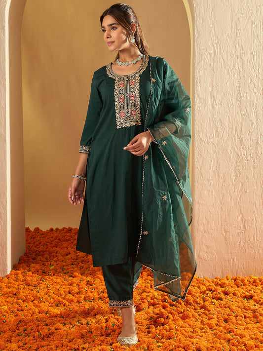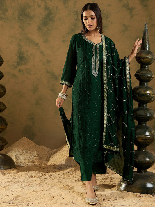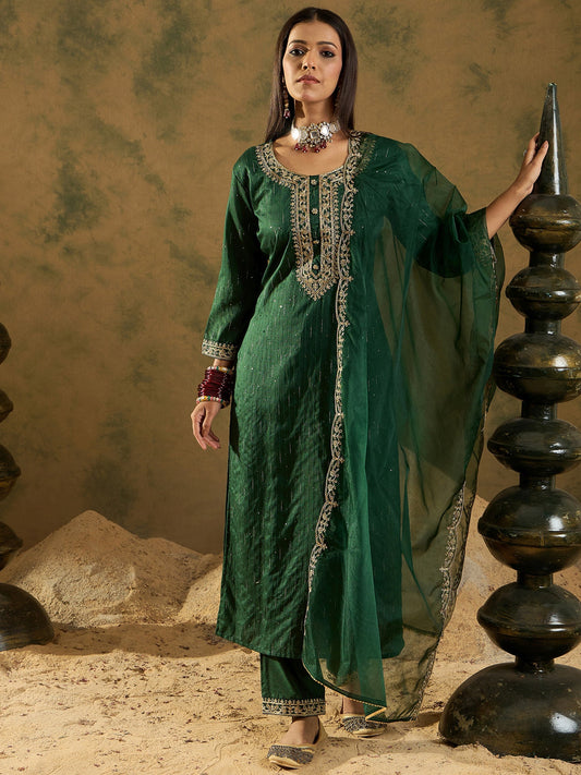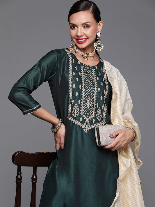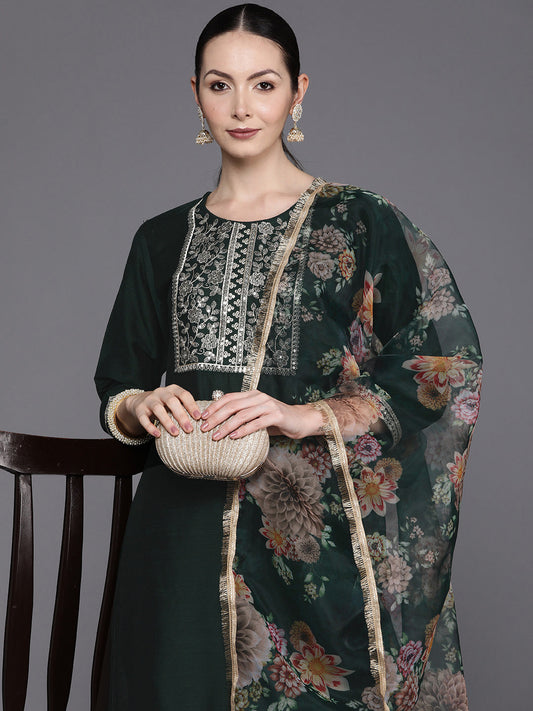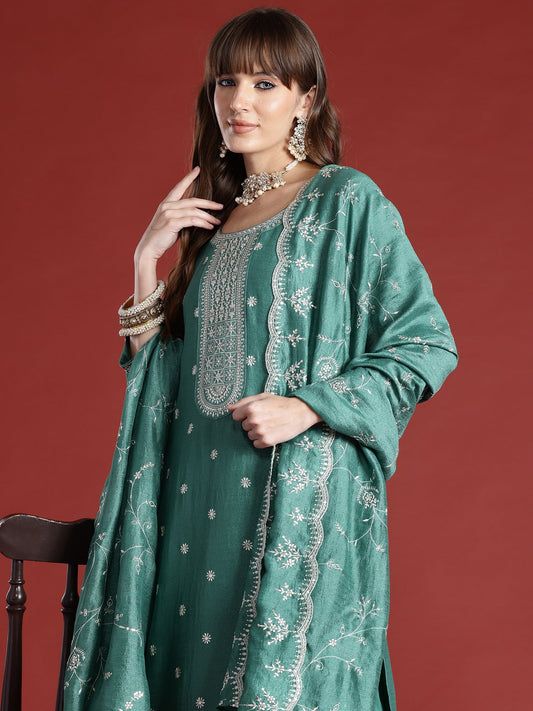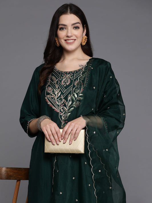 Indo Era Green Floral Embroidered Regular Sequinned Chanderi Silk Kurta with Trousers & Dupatta