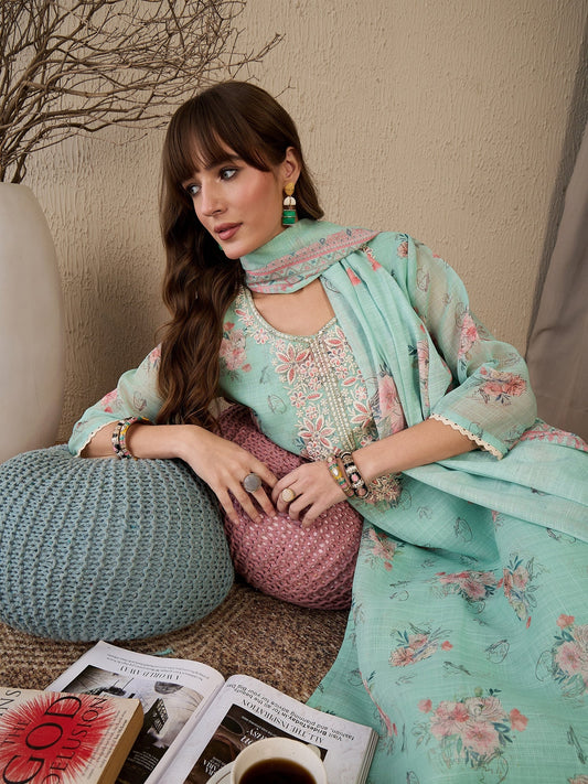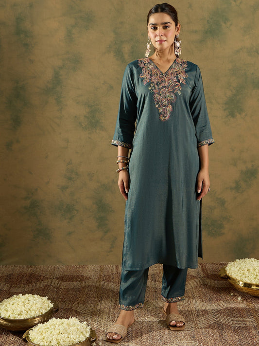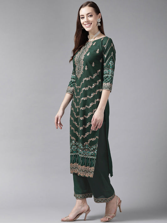 Indo Era Green Floral Embroidered Straight Kurta With Palazzo Set