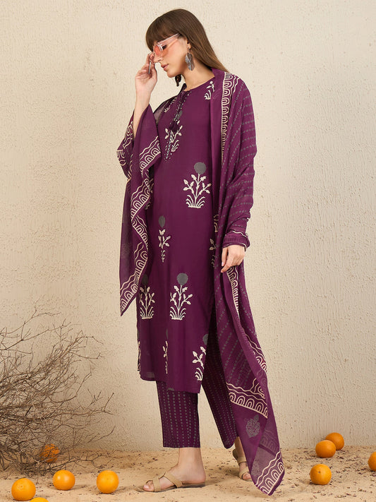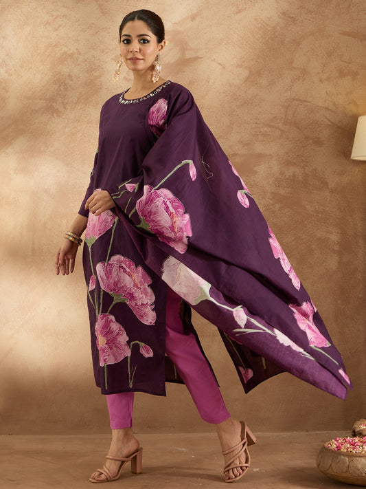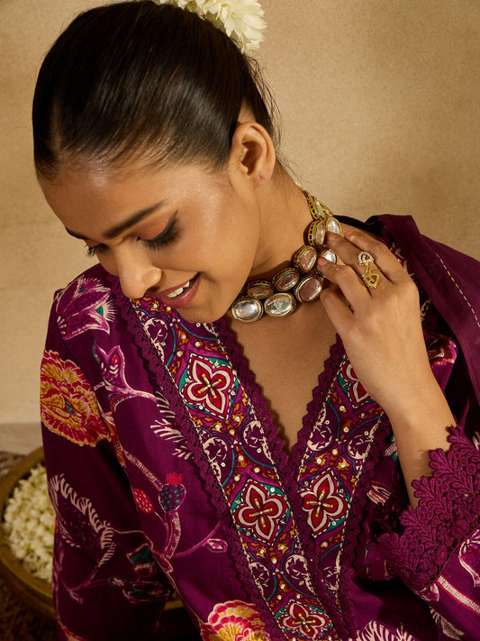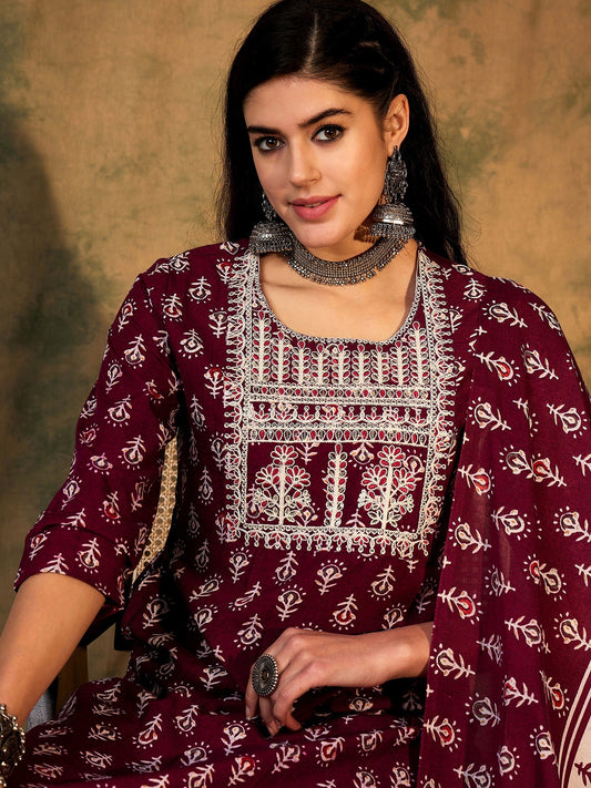 Indo Era Burgundy Printed A-Line Kurta Trousers With Dupatta set