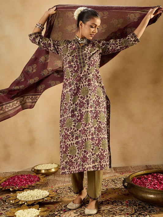 Indo Era Cream Printed A-Line Kurta Trouser With Dupatta Set