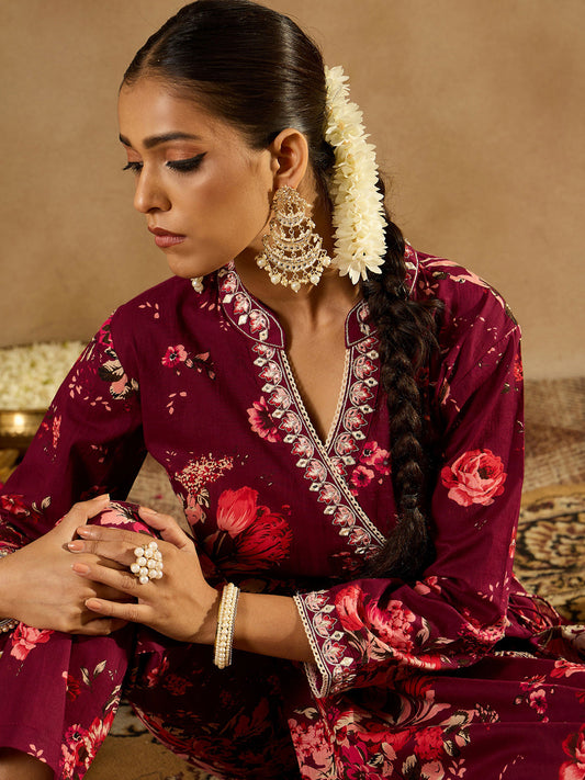 Indo Era Burgundy Printed Straight Kurta Trousers Set