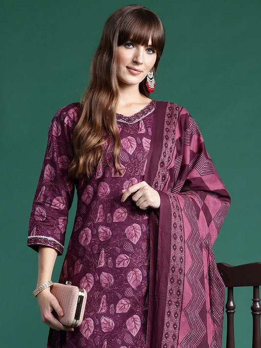 Indo Era Burgundy Printed Straight Kurta Trousers With Dupatta Set