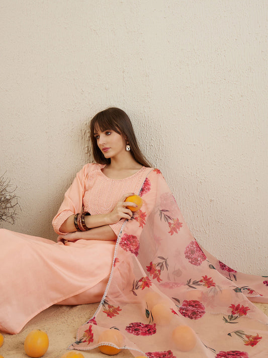 Indo Era Embroidered Orange Straight Kurta Trouser With Dupatta Set