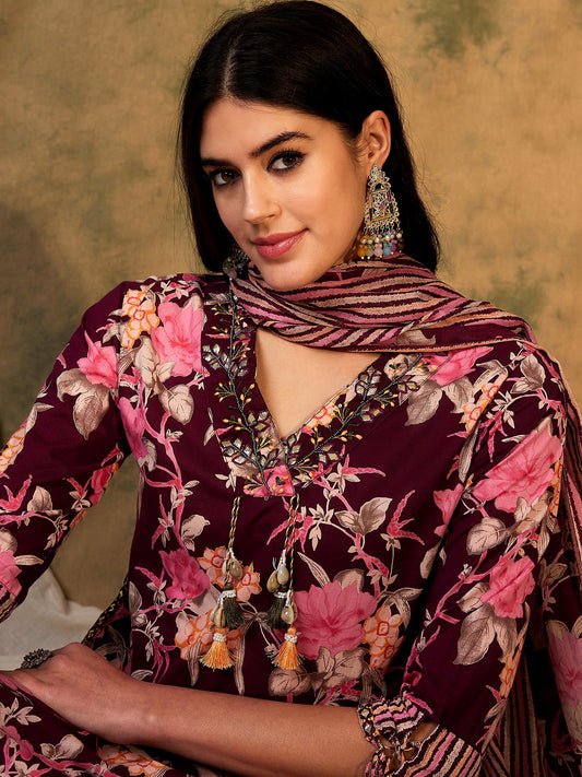 Indo Era Burgundy Printed Straight Kurta Palazzos With Dupatta set