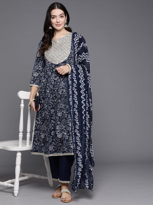 Indo Era Blue Embroidered A-Line Kurta Trousers With Dupatta Set