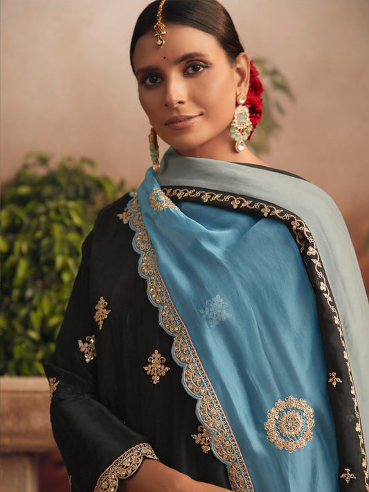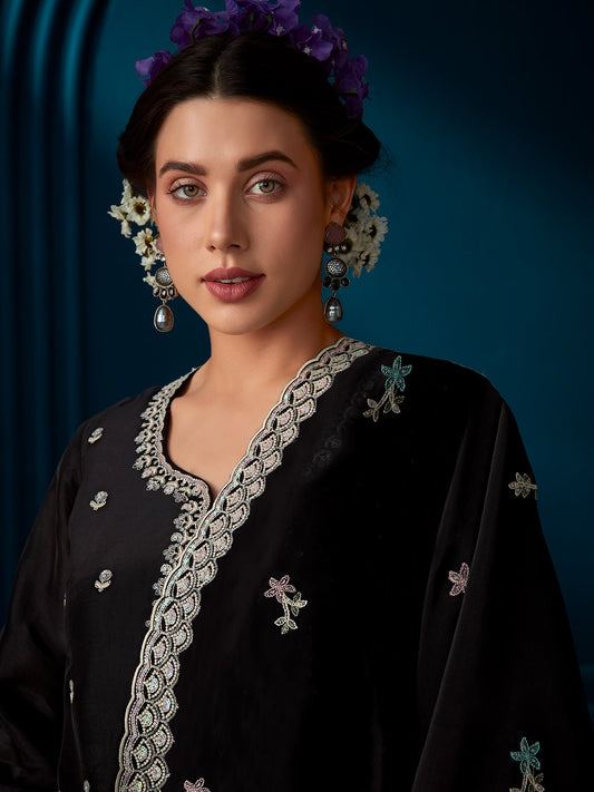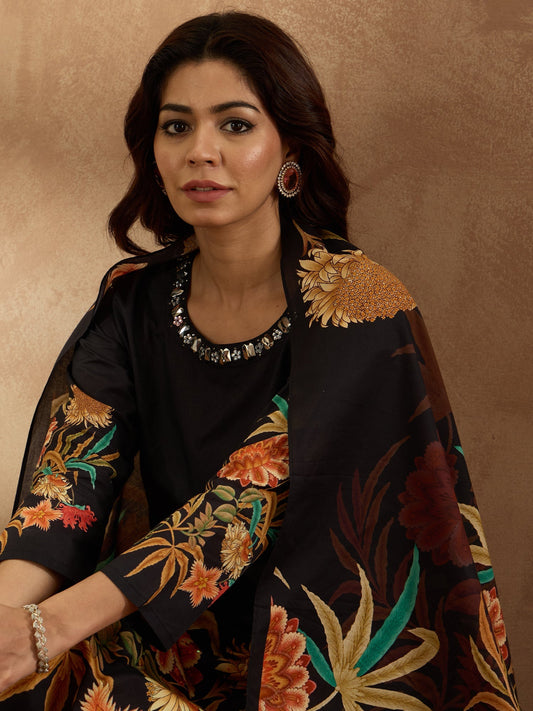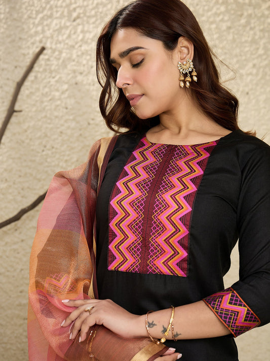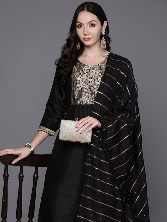 Indo Era Black Straight Embroidered Kurta Trousers With Dupatta Set
