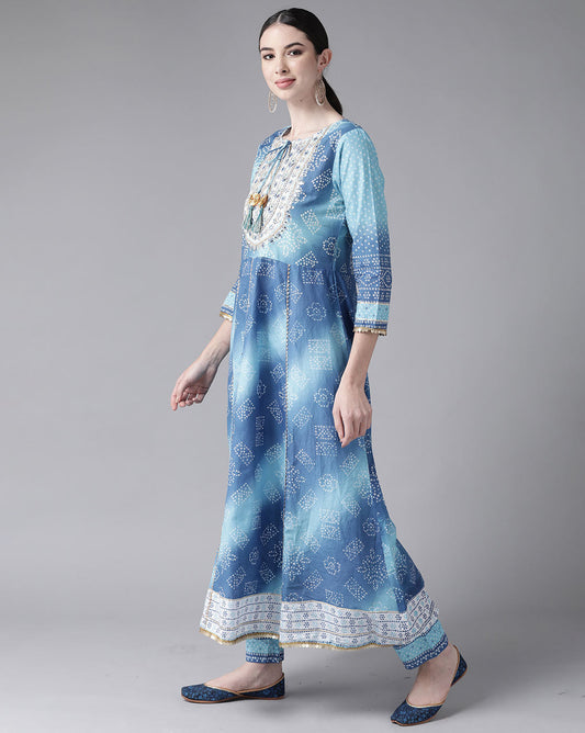 Indo Era Blue Embroidered A-line Kurta with Trouser