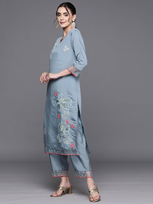 Indo Era Blue Embroidered Straight Kurta Trousers set