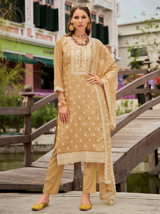 Cream Embroidered Straight Kurta Trousers With Dupatta set