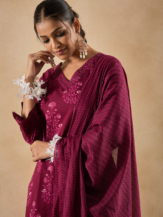 Burgundy Printed A-Line Kurta Trousers With Dupatta Set