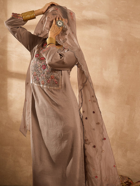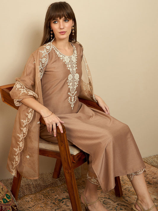 Brown Embroidered Straight Kurta Trousers With Dupatta set