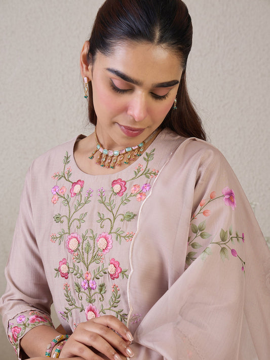 Brown Embroidered Straight Kurta Trousers With Dupatta Set