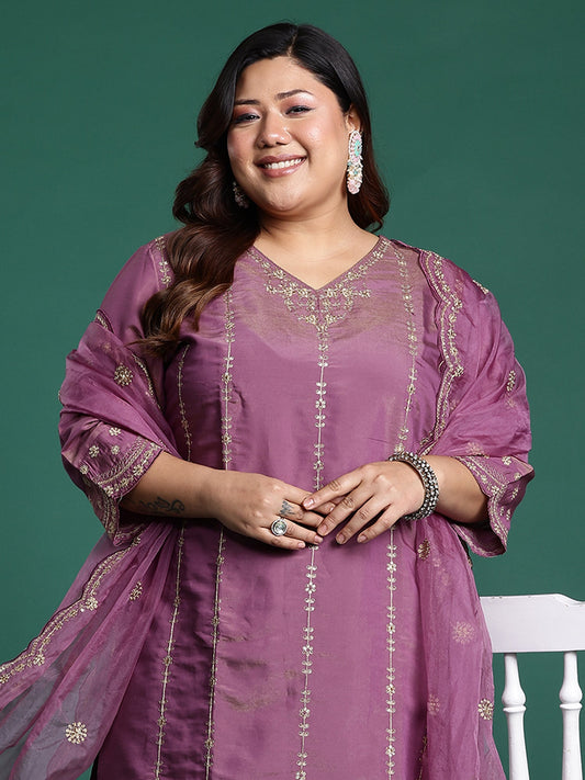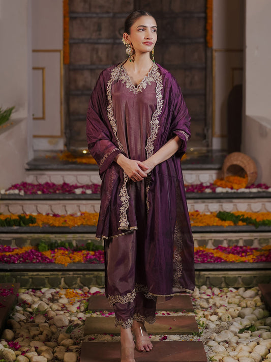 Burgundy Embroidered A-Line Kurta Trousers With Dupatta Set