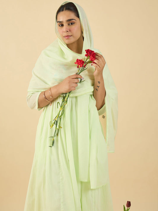 Green Embroidered A-Line Kurta Palazzos With Dupatta Set