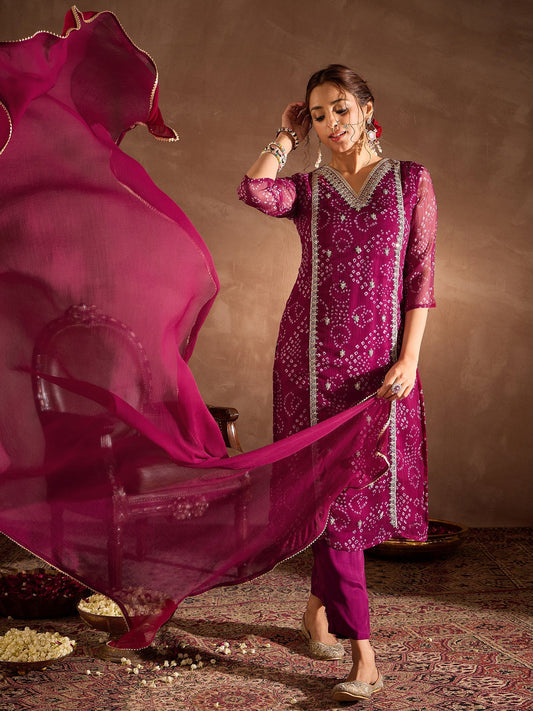 Burgundy Printed Straight Kurta Trousers With Dupatta Set