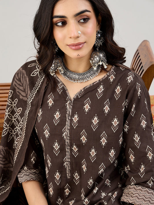 Brown Printed Straight Kurta Trousers With Dupatta set