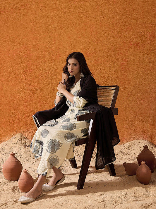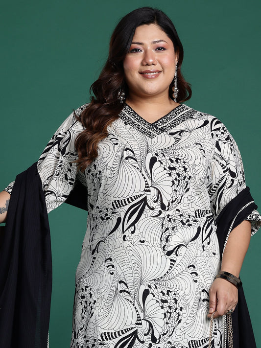 Cream Printed Straight Kurta Trousers With Dupatta Set
