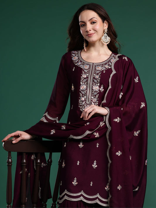 Burgundy Embroidered Straight Kurta Sharara With Dupatta Set