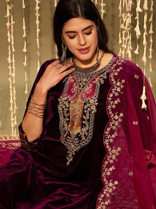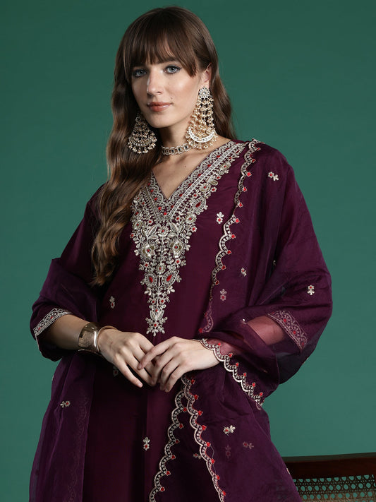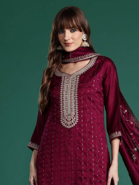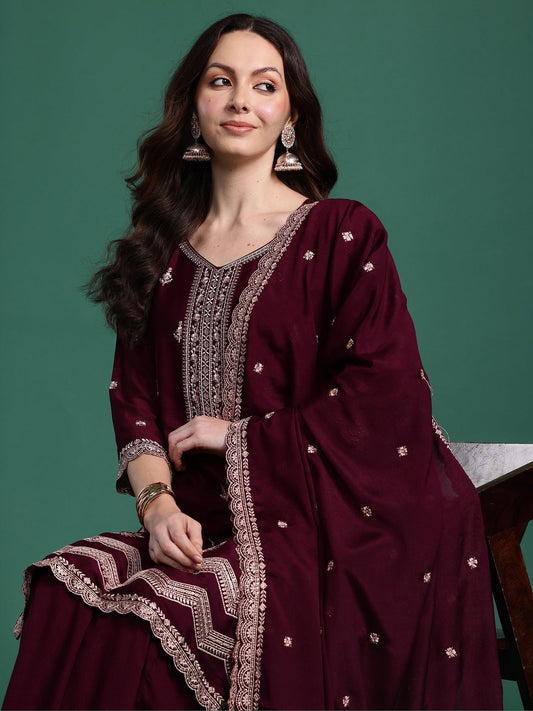 Burgundy Embroidered Straight Kurta Palazzos With Dupatta set