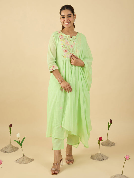Green Embroidered A-Line Kurta Trousers With Dupatta Set