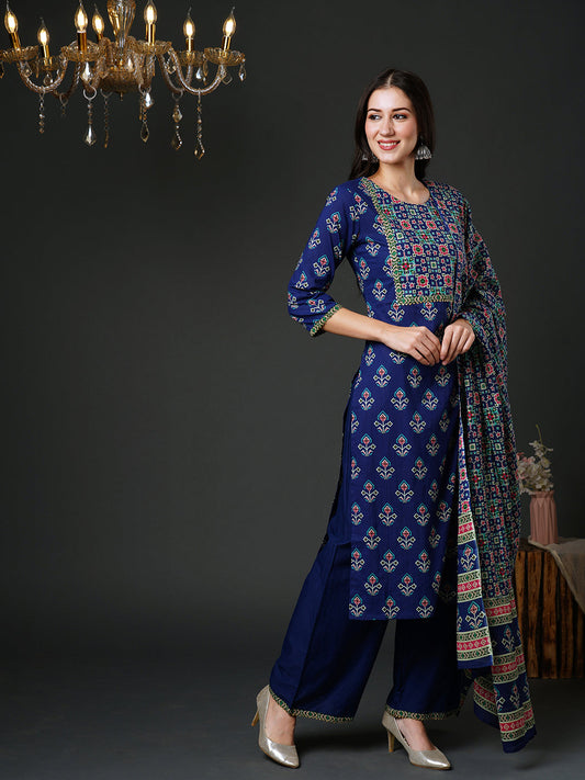 Indo Era Blue Ethnic Motifs Printed Gotta Patti Pure Cotton Kurta with Palazzos & Dupatta
